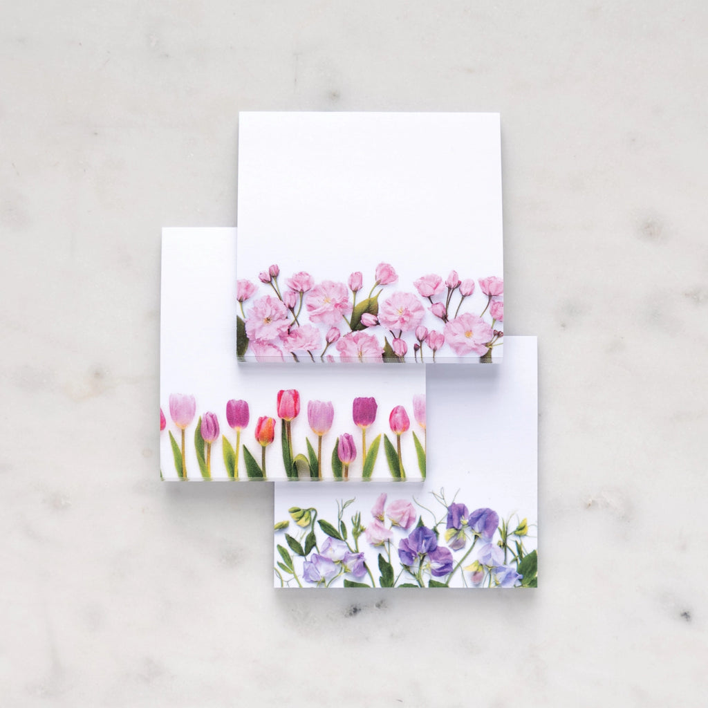 Set of three sticky notepadsfeaturing spring flowers - cherry blossom, pink tulips and sweet peas. 50 sheets per pad. Sticky notepads are lined up and sealed in a clear protective envelope, with a kraft brown backing card.